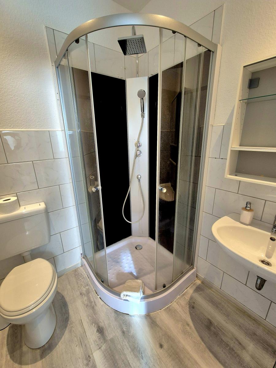 Das Badezimmer ist mit Dusche ausgestattet.