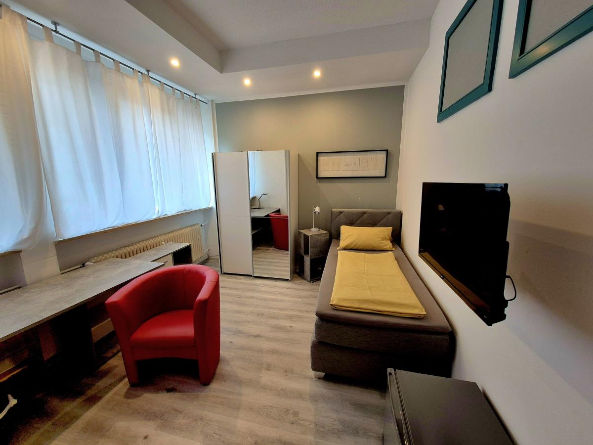 Das Apartment ist mit einem komfortablen Boxspringbett (80x200 cm, Härtegrad H3), einem praktischen Schwebetürenschrank mit integriertem Safe sowie einem modernen Eckschreibtisch ausgestattet. Zur weiteren Ausstattung gehören ein Minikühlschrank, ein Smart TV und kostenfreies WLAN.